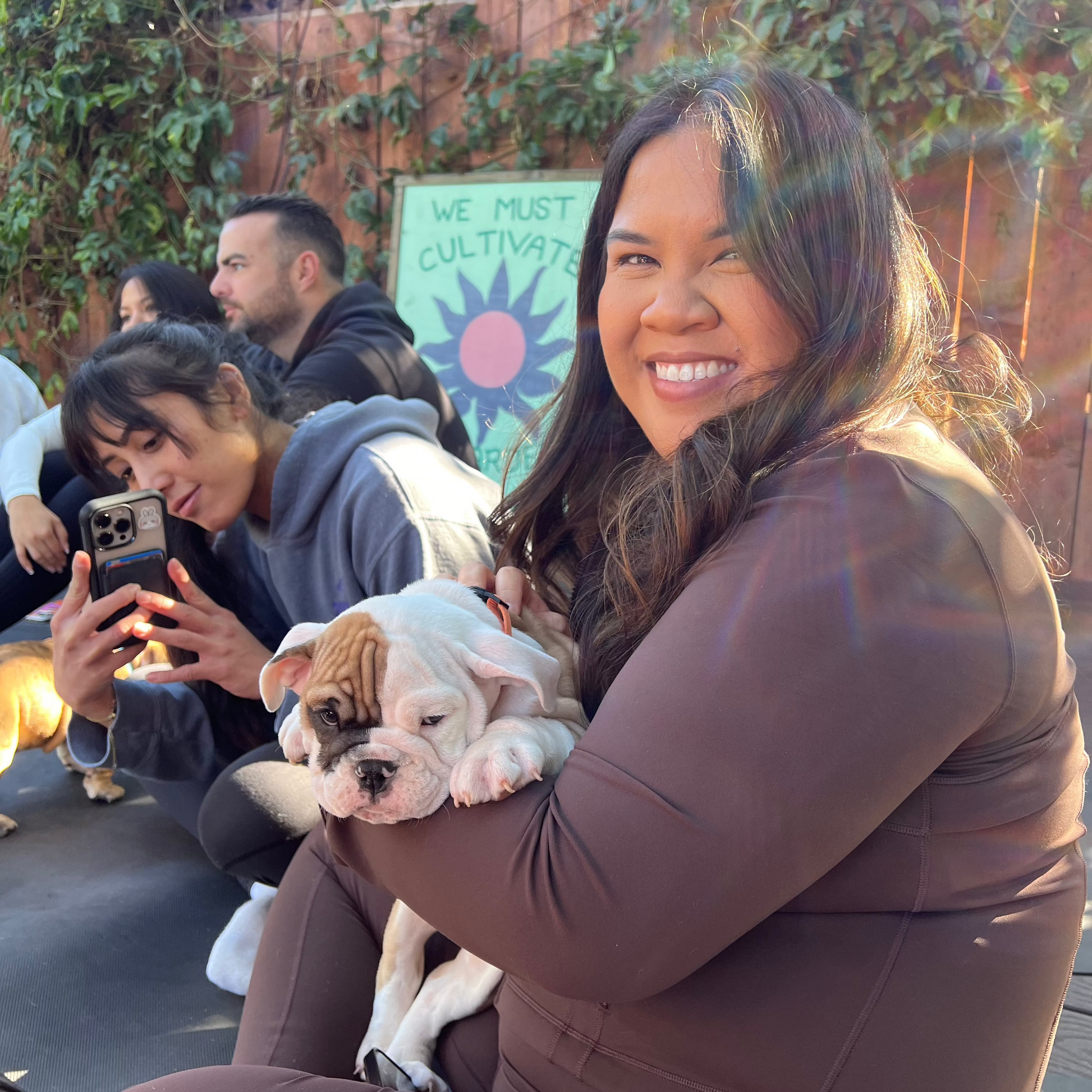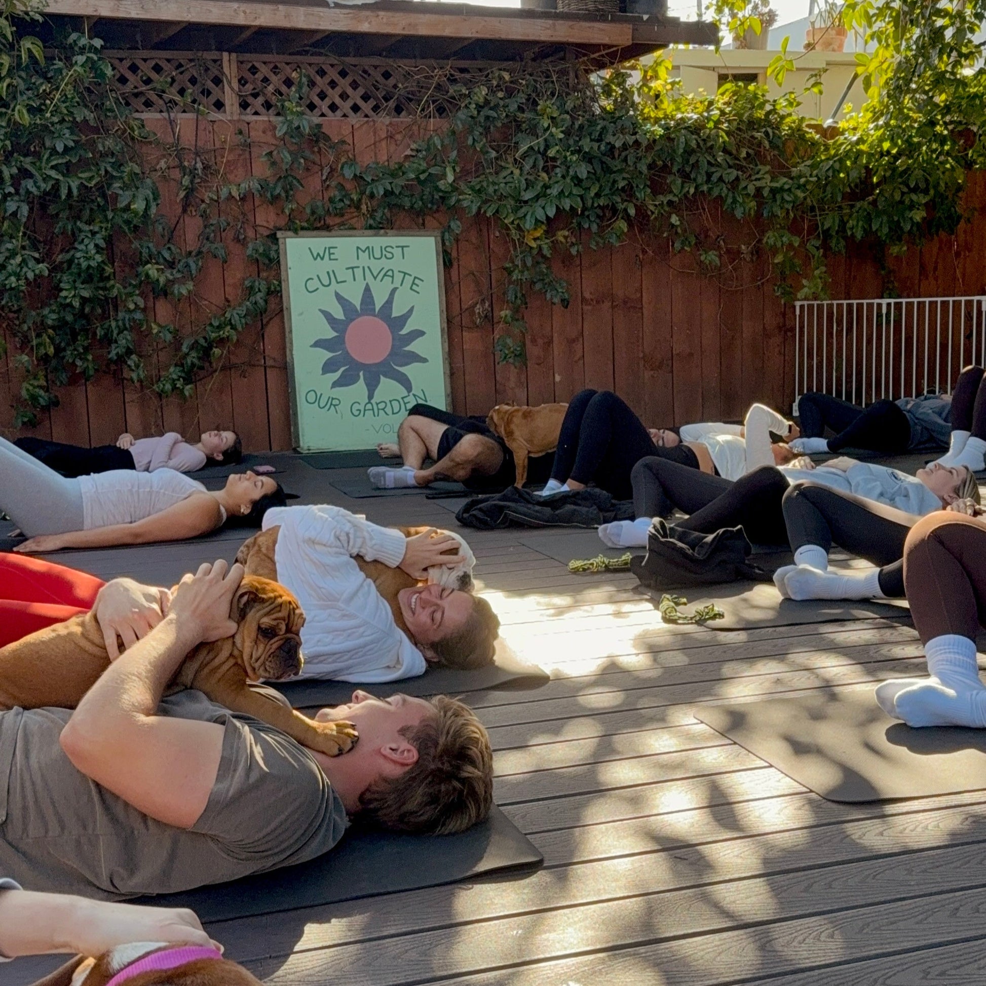 Our studio offers a serene and inviting outdoor oasis, surrounded by lush greenery and a peaceful ambiance, perfect for a relaxing and joyful puppy yoga experience.